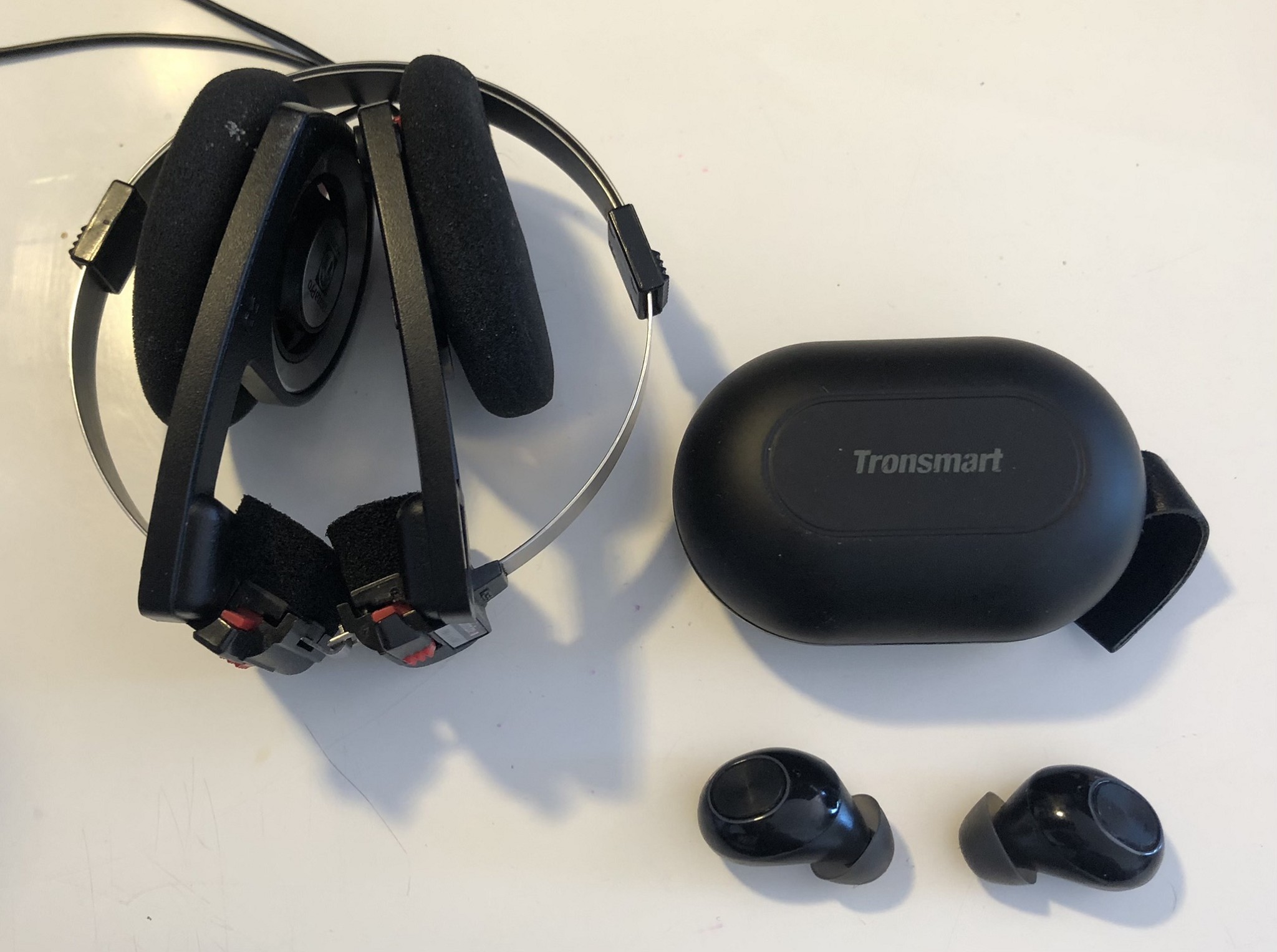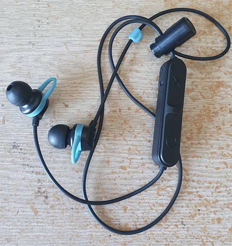 My two main ear-listening-pieces are some Koss Porta Pro headphones (recommended by an internet friend) that cost 25 quid and sound pretty great, that I mainly use for playing Fortnite and occasionally for drowning out the wife's work Zoom calls, and some Tronsmart Spunky Beat(?!) earbuds that I bought based on a review on Scarbir's awesome "wireless earbuds under $100" review site. I use these (actually only the right one) to listen to audiobooks and podcasts while walking/running with the dog. They sound good and fit pretty well but the "touch controls" are a bit OTT and occasionally they'll decide to call one of your contacts at random, which can be annoying.