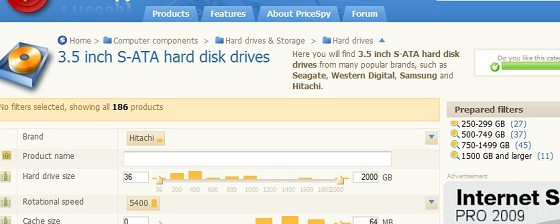 The new PriceSpy is not only a price comparison site but also a product comparison site. If you are looking for a hard drive – 3,5 S-ATA, for example, type in "3,5 s-ata" in the search box in the blue field without pressing enter. Then click on the category "3.5 inch S-ATA hard disk.