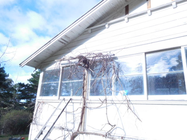 My cat Moe helping prune the grape vines.