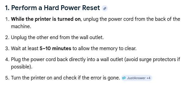 As checked with our backend team, we request you to make the printer standalone by removing all peripherals, including the power cord and any other connected devices. Then, power off the printer, press and hold the power button for 20 seconds, and release it.