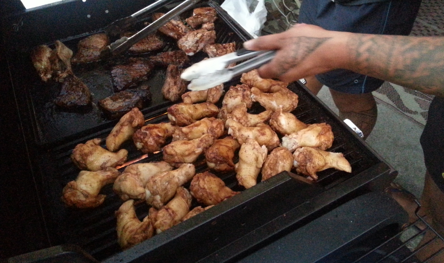 One mate ran out of chicken and decided he was too lazy to cook any more, he drove off up to KFC and got himself a family bucket. To his credit he did share, some of us skinned the regular drumsticks and grilled them quickly with some homemade sauce :)