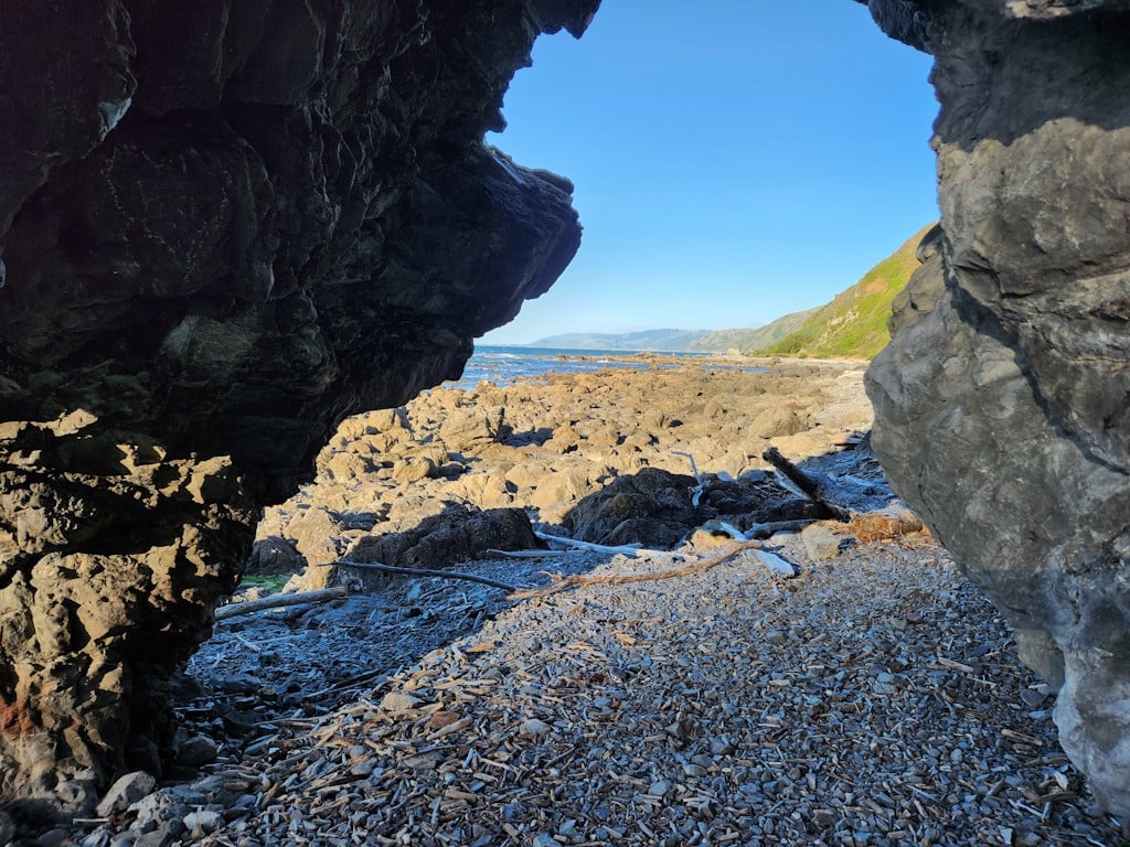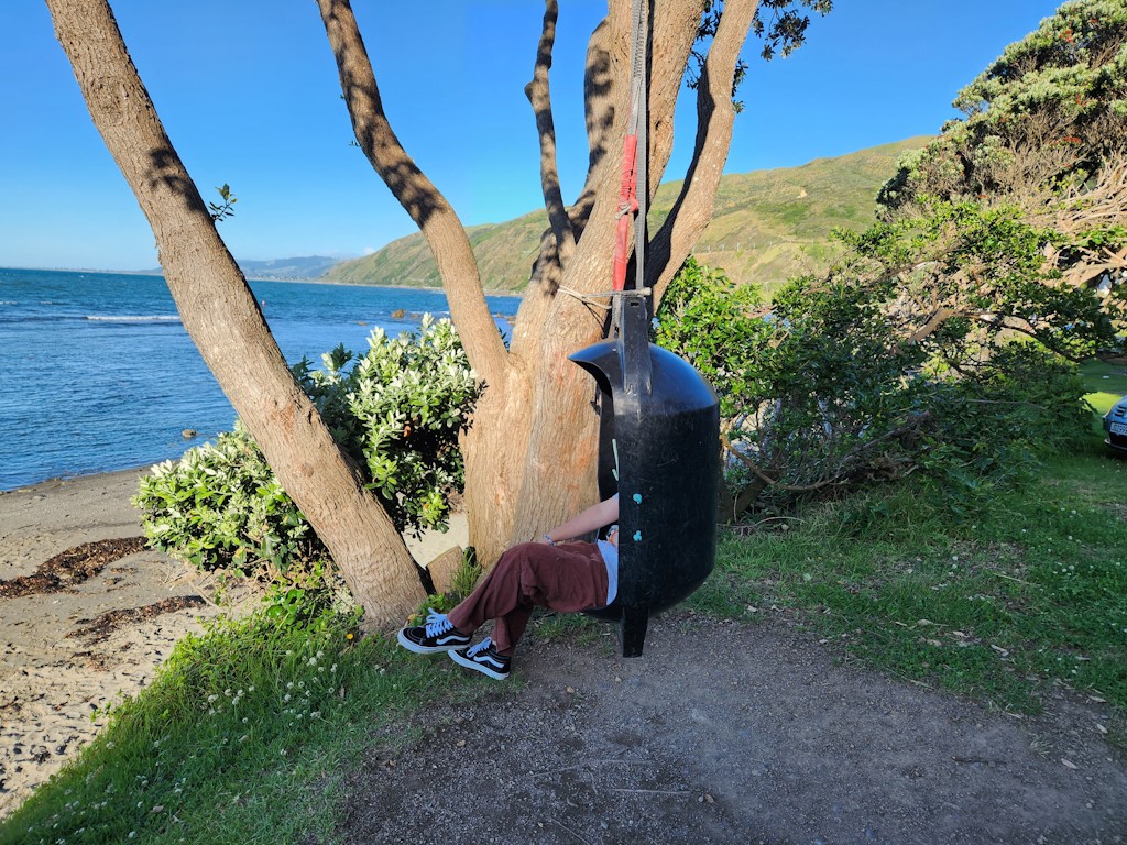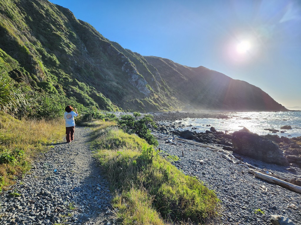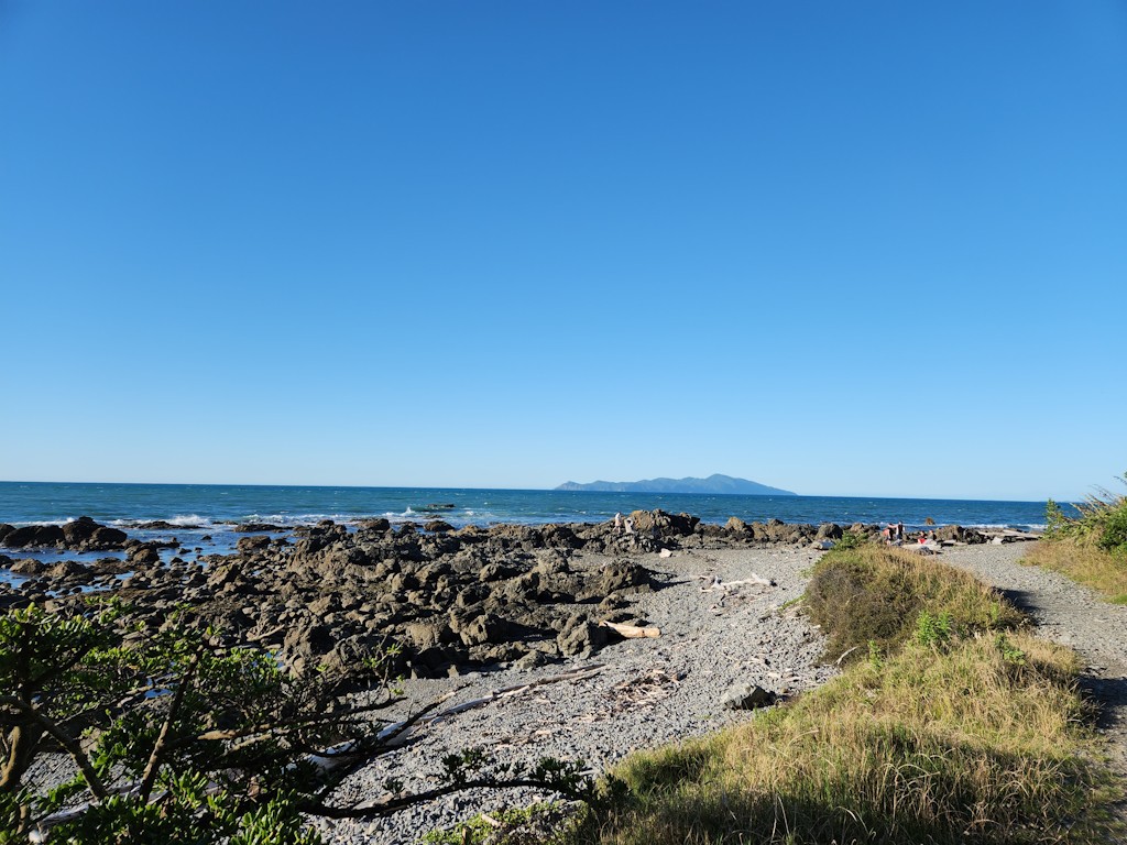 New Year's Day picnic in Pukerua Bay, walk with daughter along the rocky shore.