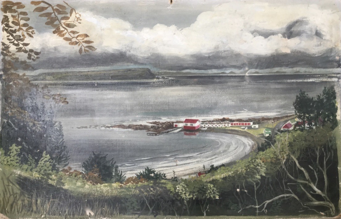 I was last there in 2020 when I had arranged to meet with the Boating Club people. Our family was close friends with Eric Heath and his family who lived up in Motuhara Road. Eric was an artist and long-term cartoonist for The Dominion newspaper back in the day. Around 1960 for fun he painted this quick picture with old house paint on a piece of hardboard. He gave it to my parents and I inherited it. It got a bit battered over the years.