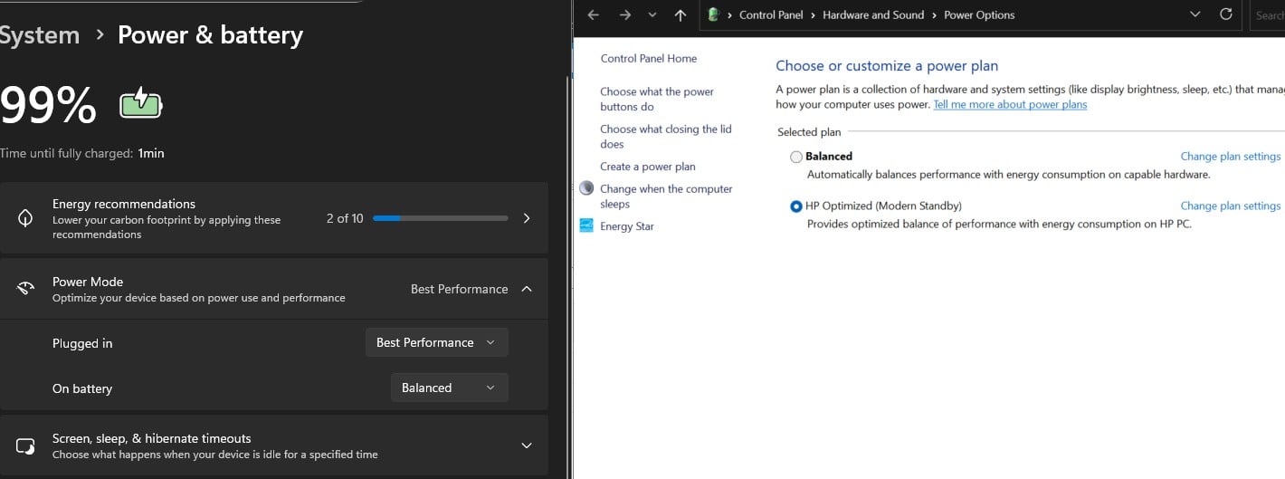 Windows 11 has two different places for defining the "power mode" or "power plan", with different user interface designs... one does not change the other, and it's not possible to tell which is actually applied or what the difference between these settings is.
