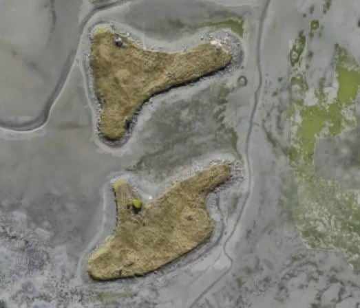 Looking out our house window over McCormack's bay in Christchurch, there are a couple of small man made islands in the causeway (between Ferrymead and Redcliffs). One looks like twig and berries and the other looks like a hand about to measure up.