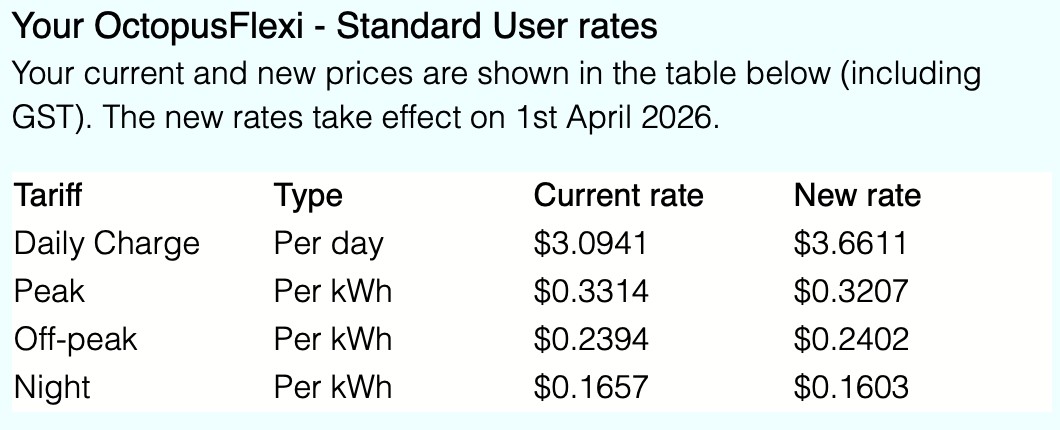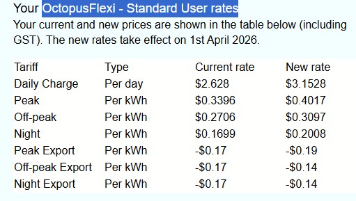 Your OctopusFlexi - Standard User rates Your current and new prices are shown in the table below (including GST). The new rates take effect on 1st April 2026.