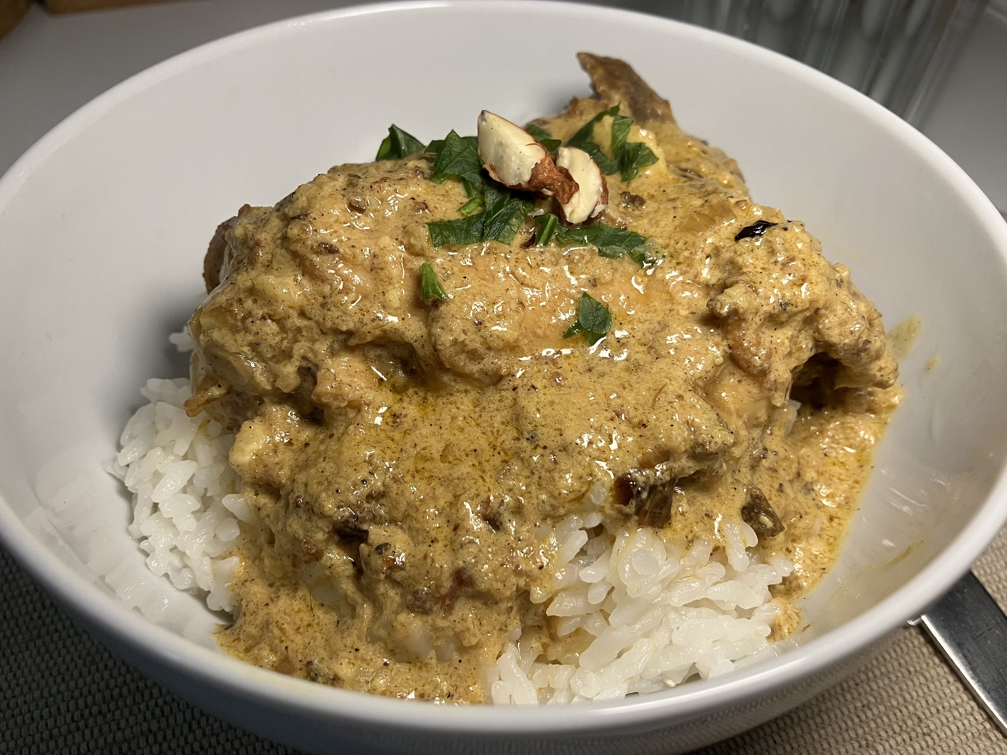 Indian chicken korma in garam masala sauce with yoghurt and almonds.