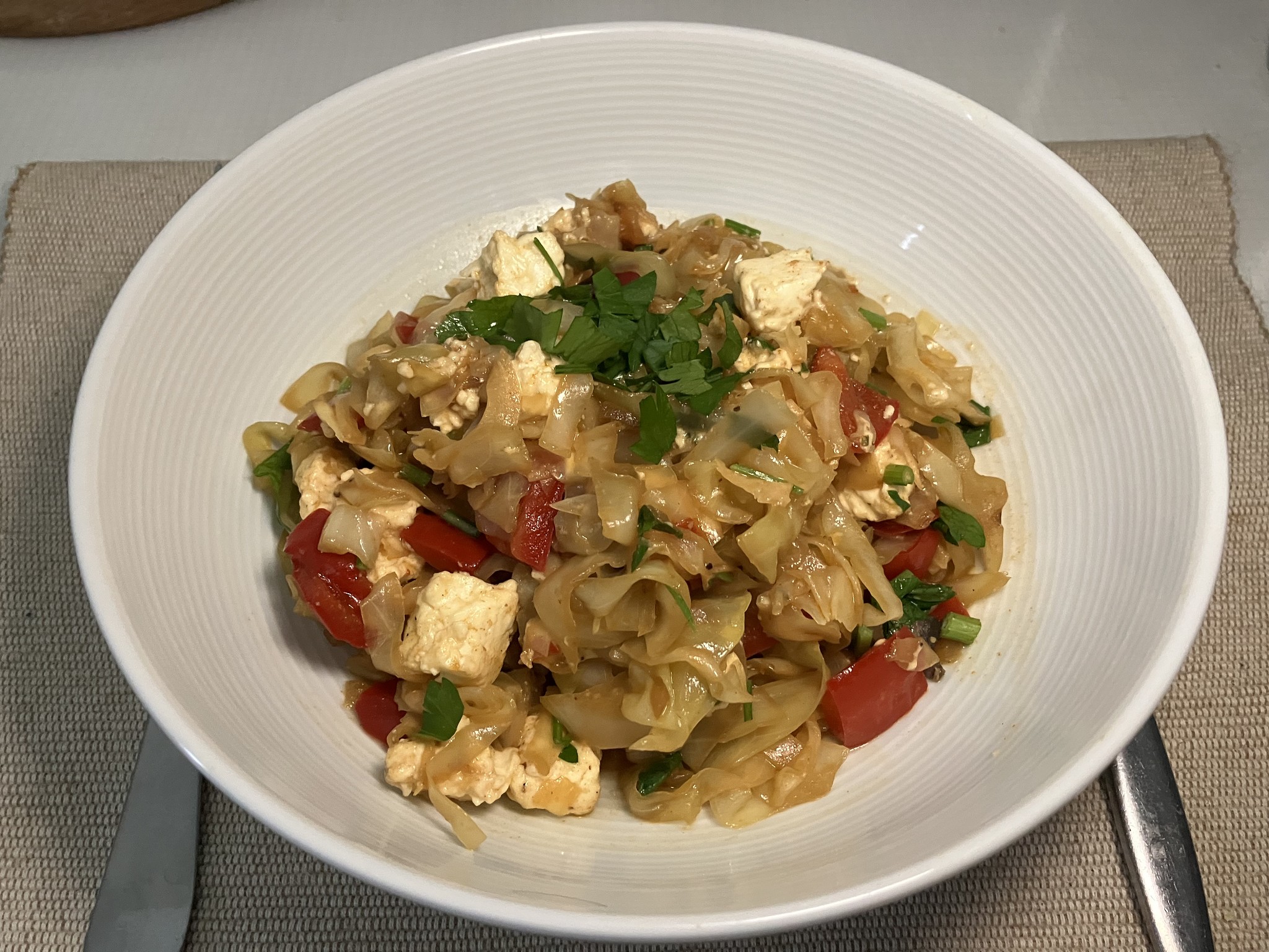 Pointed cabbage stir-fry with bell peppers and feta cheese. It's winter here, it's snowing outside and it's frosty.