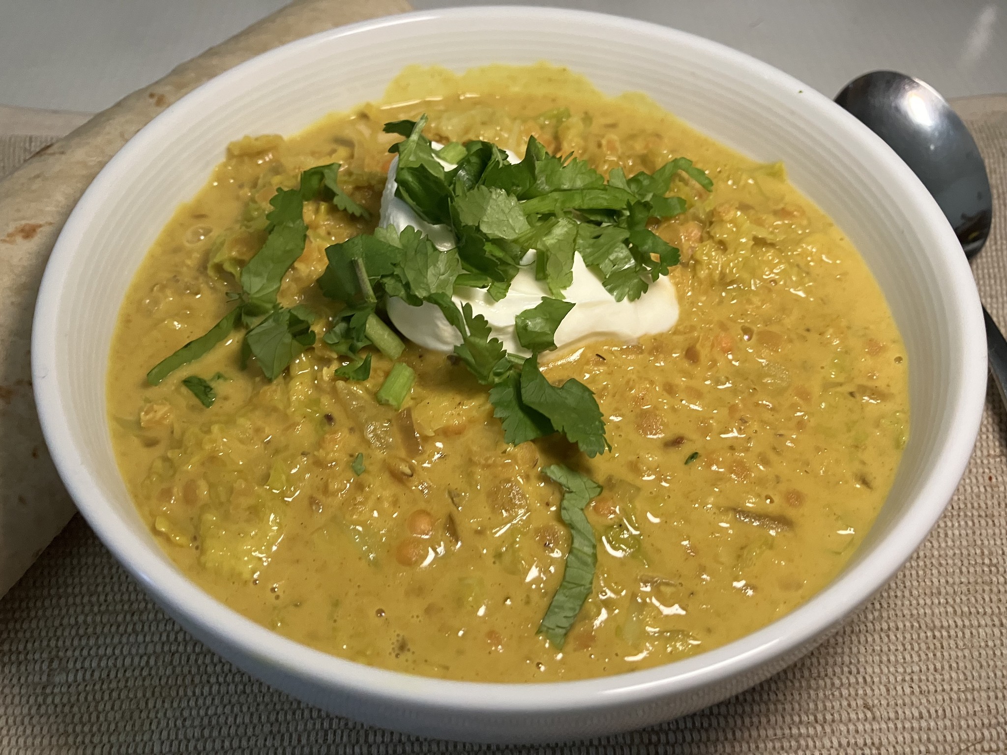 Savoy cabbage, red lentil and coconut stew with yoghurt and... yes(!), coriander! 😁