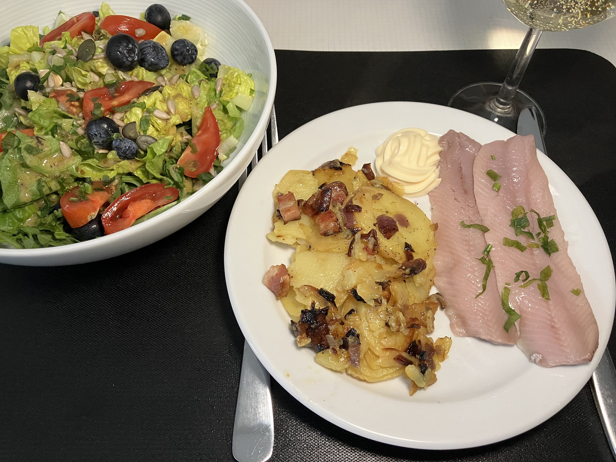 Smoked matjes fillets (smoked fermented herring fillets) with bacon-fried potatoes and "house salad". We have -9 DegC and a snow storm outside. 😁