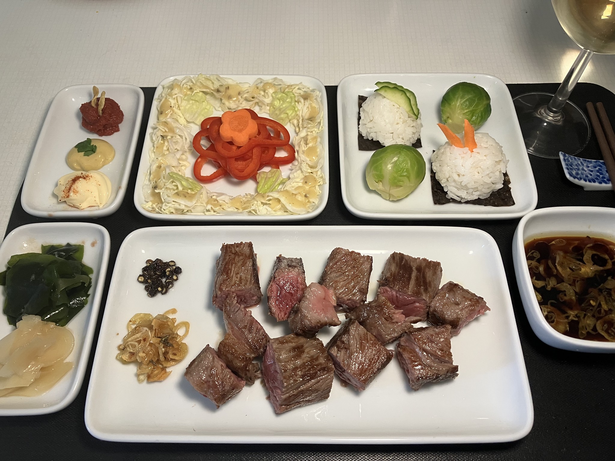Japanese-style garlic steak, medium/rare, with side dishes and dips.