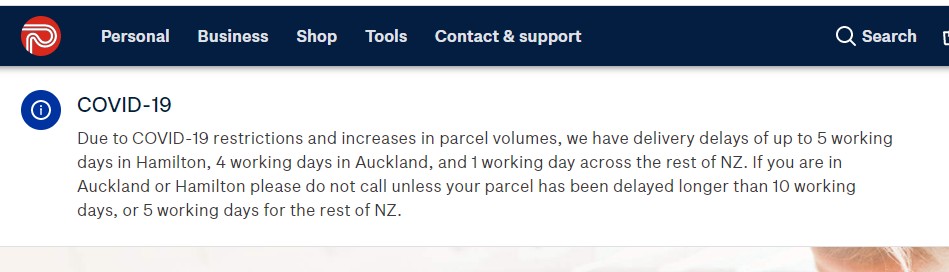Due to COVID-19 restrictions and increases in parcel volumes, we have delivery delays of up to 6 working days in Hamilton, 3 working days in Auckland, and 1 working day across the rest of NZ.