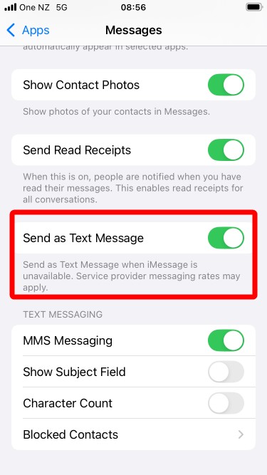 ** There is an option to fall back to standard SMS / TXT functionality if sending via iMessage fails. At this point in time, the iMessage (blue bubble) is converted to a standard SMS / TXT / PXT (green bubble) and there will be a charge for the message. This auto-fallback can be disabled in the Message settings