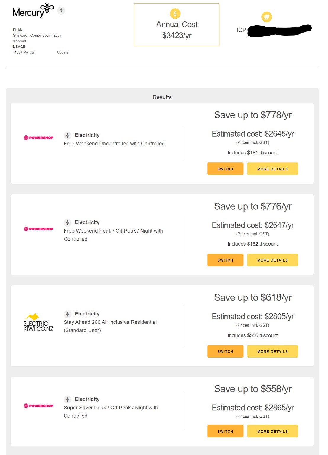 -After inputting details (including a month-by-month breakdown of usage), powerswitch.co.nz suggested Powershop and Electric Kiwi as the top two options, both saving $6-700 over the course of a year.
