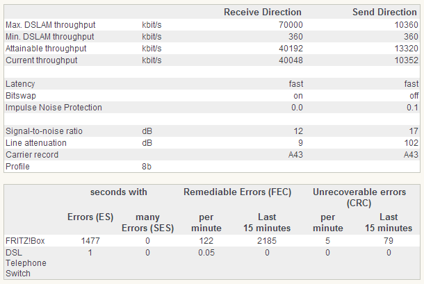 I had adjusted the SNR on my fritzbox from 12db to 7db, and this had increased my downstream speed from 35mb/s to 43mb/s..... life has been fine on that setting for about a month, unrecoverable errors per minute sitting on about 4, and DLM-2 profile.... I was happy with this.