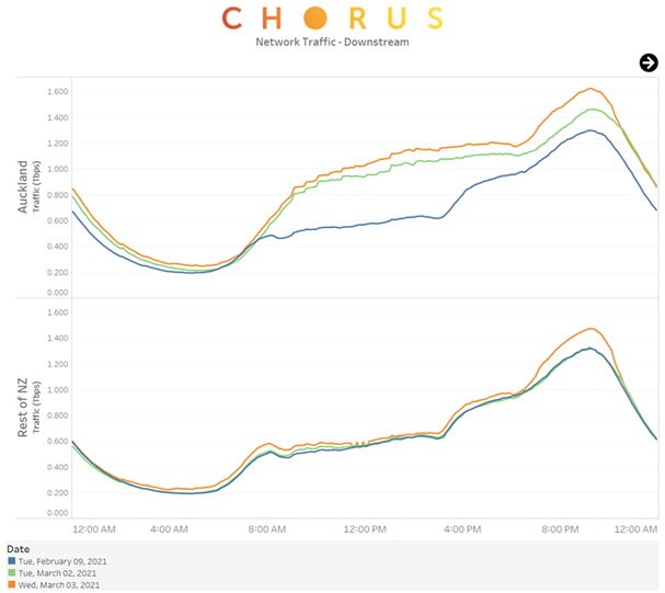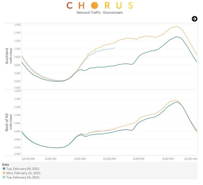 Chorus reports midday downstream traffic on its network reached 1.62Tbps today, an increase of 43 percent on last week. The Auckland region saw a 75 percent uplift in traffic, while the rest of New Zealand increased 11 percent.