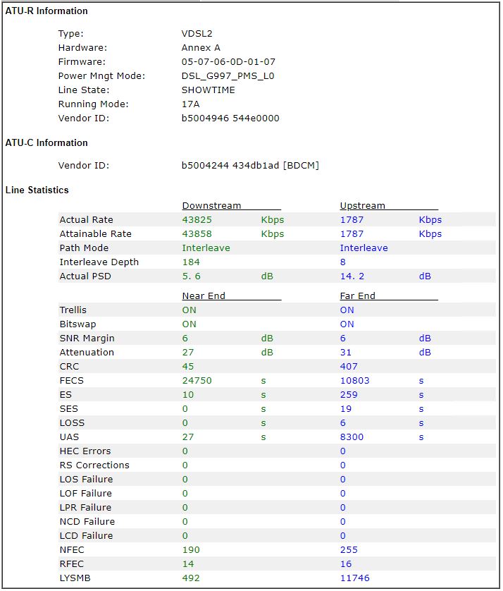 The internal wiring was redone and now the modem is basically hanging off the demarc. This is the second modem I've tried (DrayTek DV130). The Huawei HG659b had a slightly higher sync rate, but hardly much. I won't lie, that upstream rate is depressing.