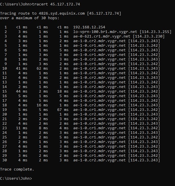 I am still unable to receive any meaningful support from them, and I think it is just time for me to switch to another ISP. I see 2 Degrees is a big favorite around here, but I am a software engineer in my day job, so although I have ~some~ networking experience, I still feel way out of my depth diagnosing this issue. I have tried pinging multiple international servers and have observed the spikes to 2500ms~ latency, but again, I'm not really sure what I'm looking for since as far as I know, I have no control over the way in which my packets are routed. I also ran a traceroute to one of the problematic servers and saw that the connection is timing out occasionally at the Equinix Sydney Exchange (45.127.172.74), an exchange that 2 Degrees also uses.