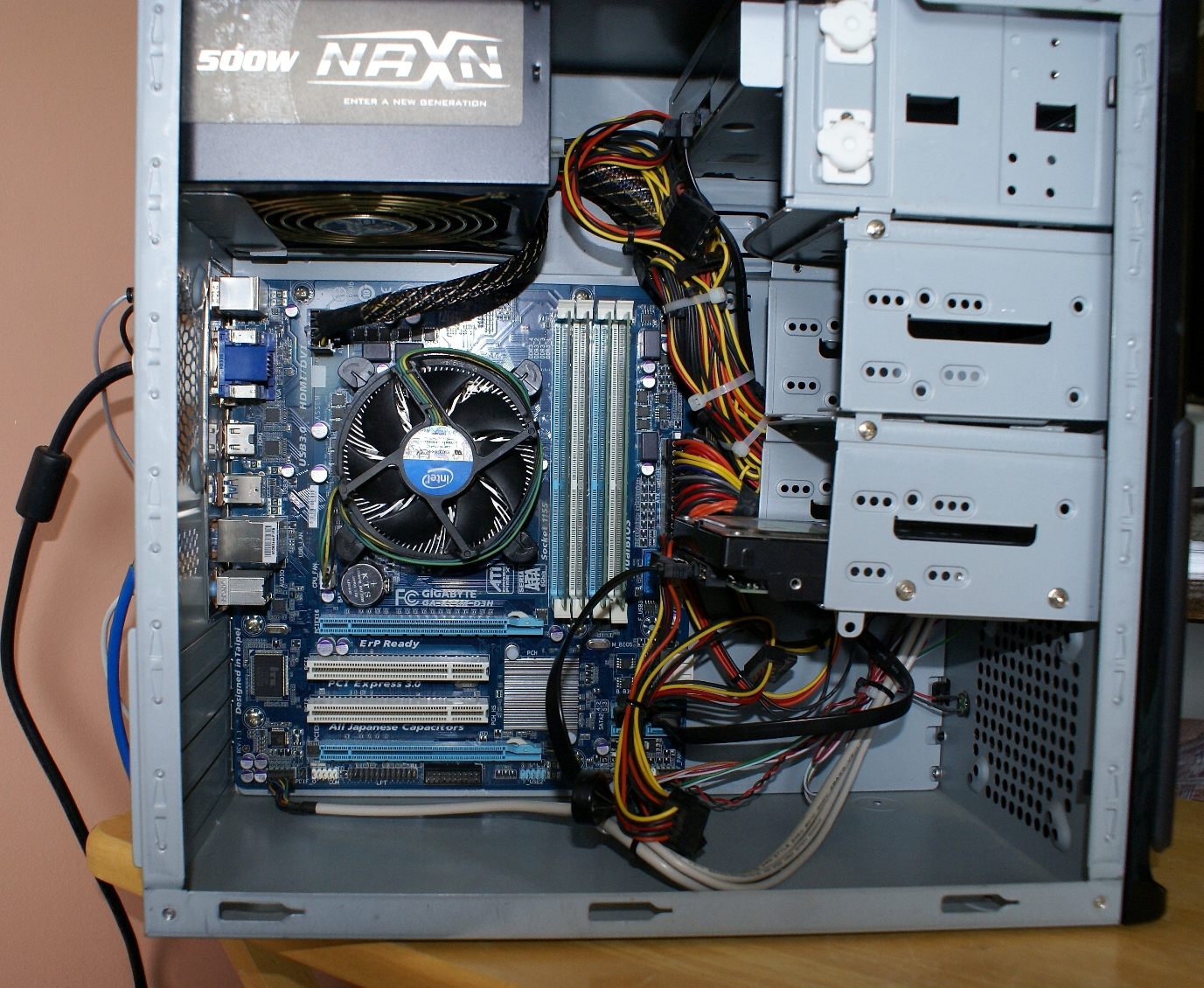 Also your PSU should have a single (red,6+2) pci-e power cable. It looks just like the black 4+4 pin cpu cable you see plugged in near the CPU cooler, top left corner of the motherboard. It might be cable tied to the rest of the cables in the case, if you can find it and free it then you'll be able to power some better cards eg. RX570 or 580.