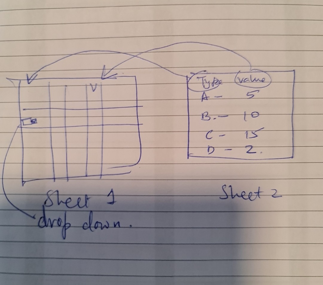 so basically i have two sheets, sheet 1 - main sheet ( it has lot of columns ) , and sheet 2 - type and values sheet.