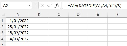 I know in cell A2 i can do =AVERAGE(A1,A4) & that will give me the middle date between start date & end date. But i would like to fill both empty cells. In 1/4's i guess?