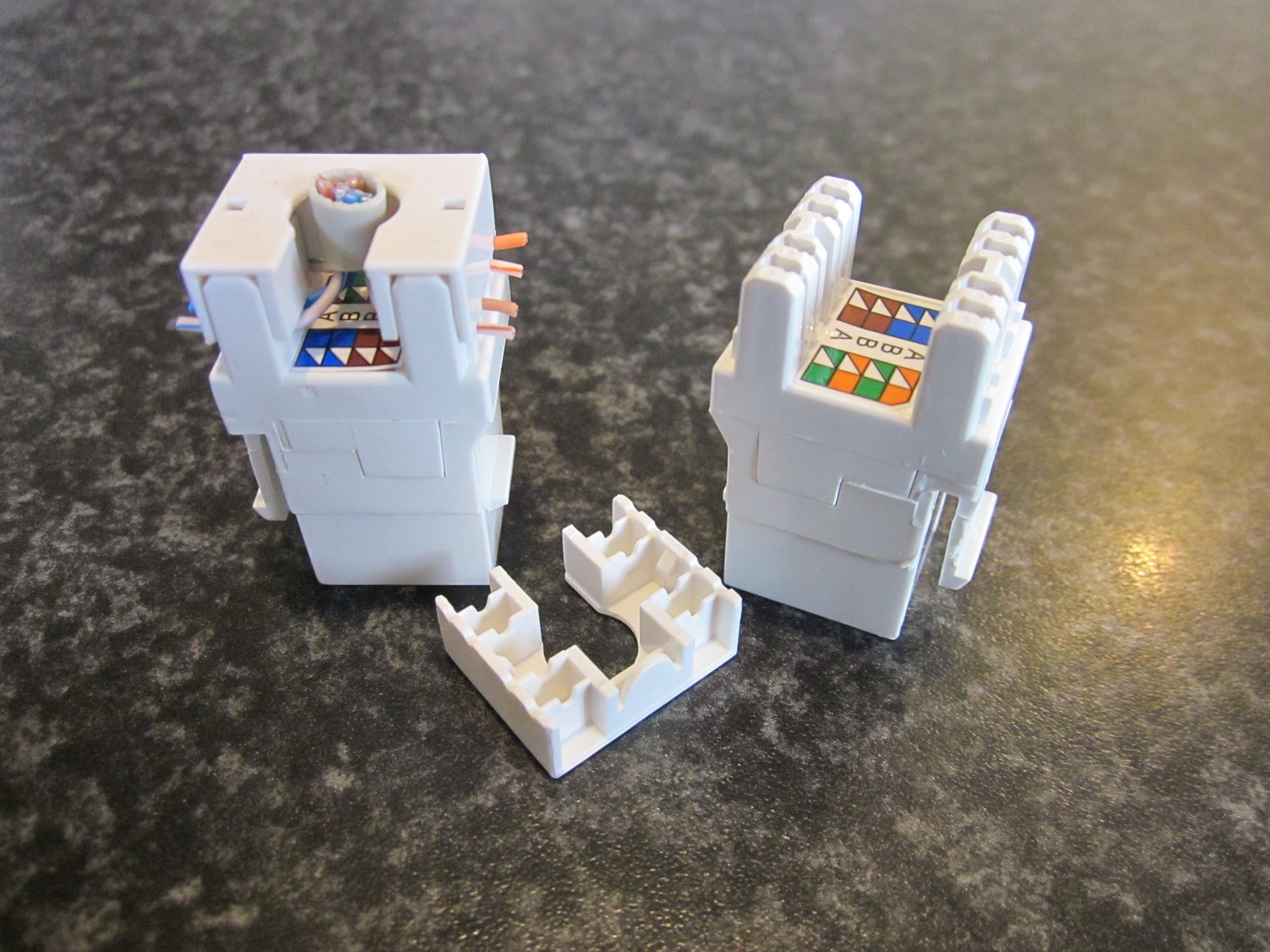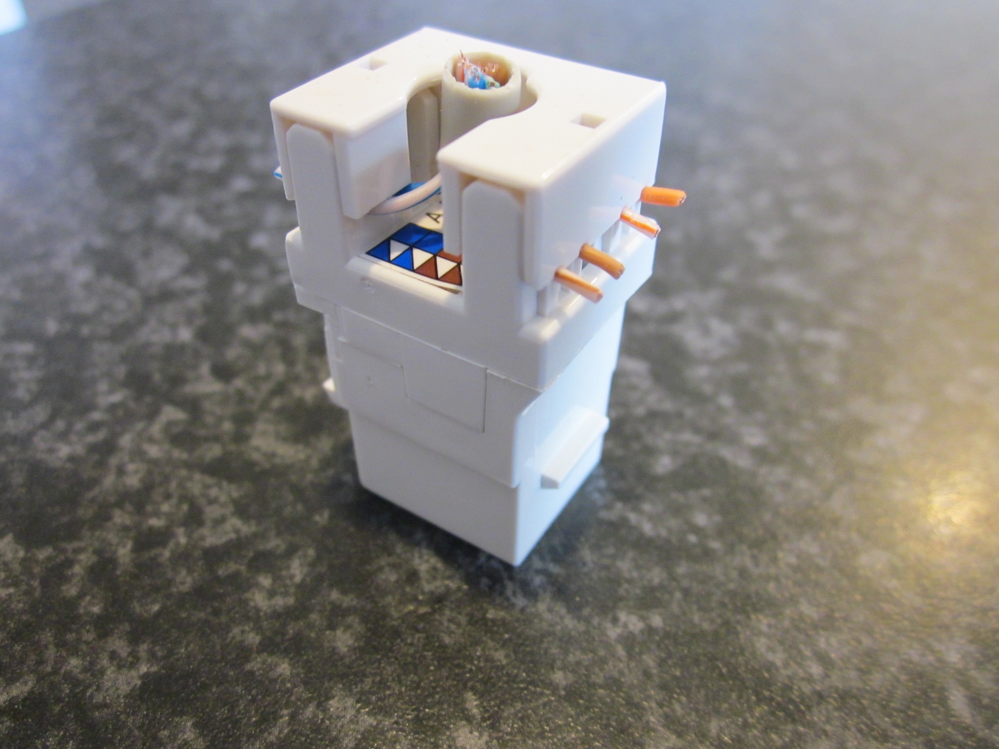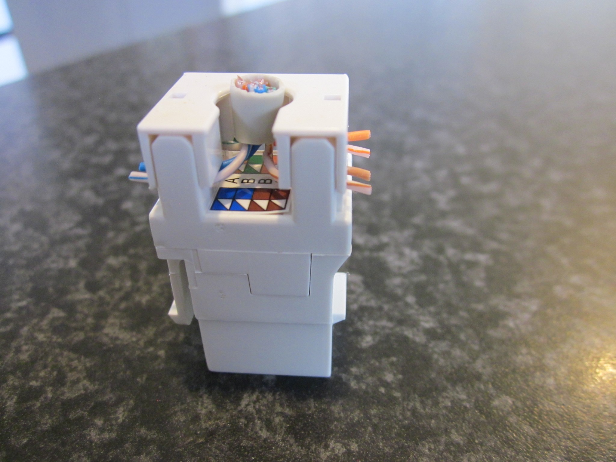 Here's a few pics. The shorn-off cable is in the 568B-configured socket that I discarded :