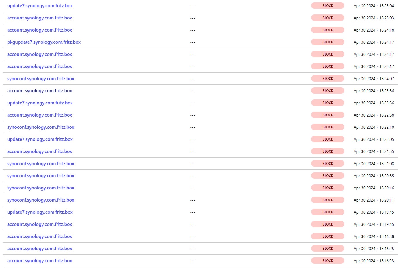 I've noticed my Synology NAS was still trying to reach multiple domains with the fritz.box domain attached. These lookups were all blocked with Cloudflare Zero Trust Gateway but... Because these lookups were returning NXDOMAIN (0.0.0.0) the NAS was getting errors when checking for updates or trying to backup the configuration.