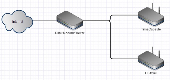 At the other end of the house, far out of range of the TimeCapsule's wireless network, I have my computer which currently gets its internet connection via a long ethernet cable which is plugged into a port on the D-Link wireless modem/router. I figured all I needed to create a wireless network at this end of the house (for my non-wired devices such as iPhone, iPad etc) was to connect another router/modem ( a Huawei HG556a) to the ethernet cable - and configure the Huawei to create a wireless network.