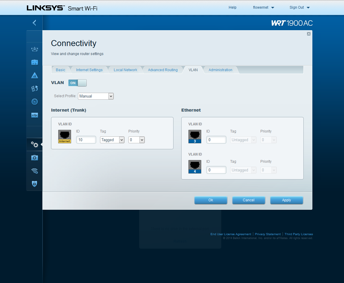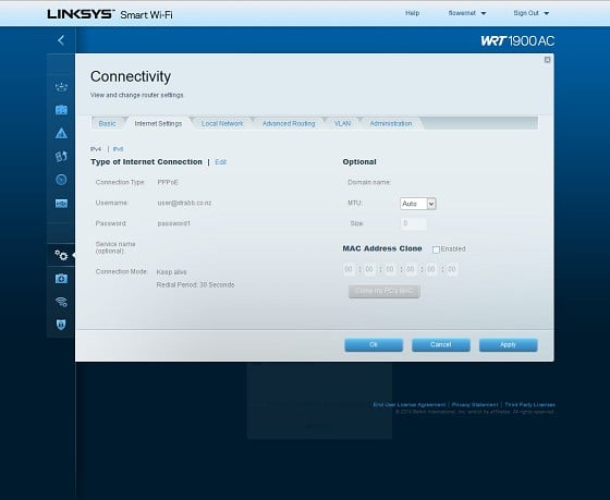 After updating the firmware on the WRT1900AC (the firmware it came with did not support VLAN tagging, and a whole bunch of other things), I attempted to connect it directly to the ONT. I tried using the cable that was supplied with my HG630b (the blue one), setting 'Connection Type' to PPPoE with the appropriate settings found on Telecom's website, and then turning on VLAN, setting the correct ID and priority.
