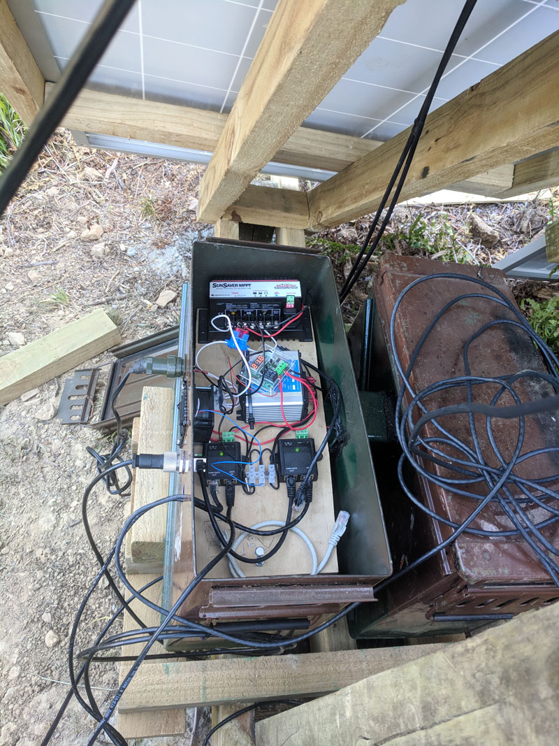 The housing for the batteries and systems are two ex-army 50cal ammo tins, with a pipe welded between them for airflow. These tins are attached to the mast/solar frame to add weight to it and stop it flying away. A 12v digital fan controller monitors the temps inside the ammo tins which turns a fan on when the temp hits 30 degrees, keeping everything nice and cool. The fan controller has a step-down convertor from 24v to 12v too. The fan intake and outflow are dust filtered and have RF shielding over top, mainly to stop bugs from getting in it but does reduce any residual noise to the environment from the solar controller which may(?) cause interference… but let’s be real, its mainly for the bugs... The battery boxes are then covered with a plywood box to stop the sun from hitting the metal and cooking everything as well as adding a second protection layer from the elements.