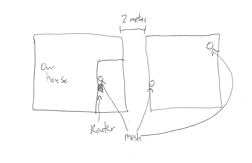 Our router in our house is quite close to the neighbouring house (approx 4 1/2 metres to the outer wall). One mesh would be connected to my router. Then I would have a mesh by the wall at the other house (so as mentioned before, approx 4 1/2 metres away from the other mesh). And then add another one elsewhere in the other house to ensure that there’s good coverage.