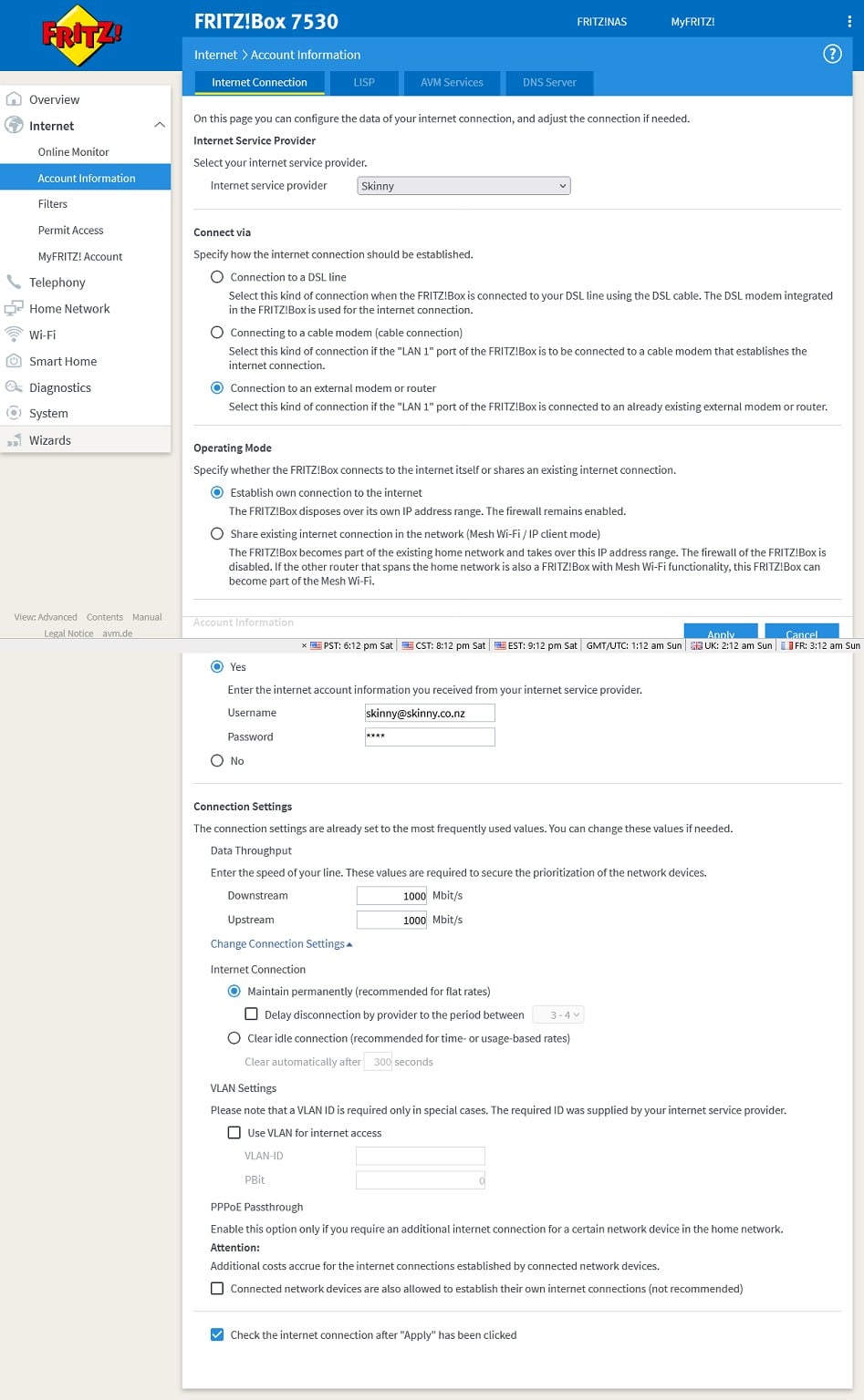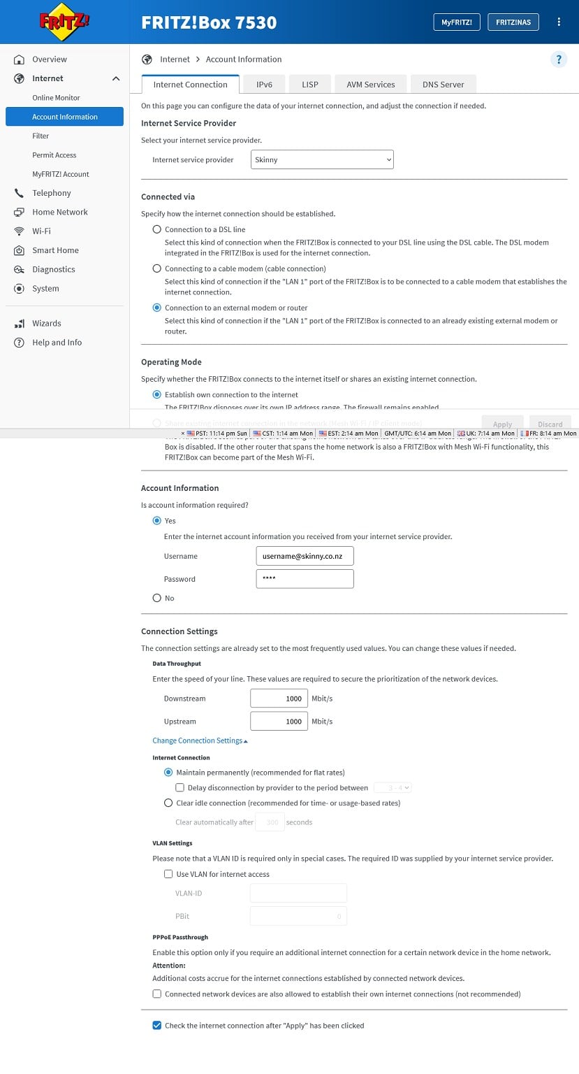Hi there, ive just had the email from Skinny saying that my new connection is ready to go (no previous internet at this house) but ive been through all the settings in the Fritz.Box UI and I cant get it to connect. I can see the wifi but there is no internet. The power/DSL light on the fritzbox is blinking continuously, not sure if this is because Skinny havnt actually connected me yet, or im doing something wrong with either the cables connection (Ive tried the ethernet cable in all ports on both the ONT and fritzbox, just to make sure), or if im still missing something in the Fritz.Box UI setup page. Ive emailed Skinny back today to ask if the connection is indeed ready to go or not (logging into their website says its not connected yet, but that could just be slow to be updated), but I thought I would ask here whilst they take their time getting back to me, in case any of you can point out something super obvious I might have missed! The fritzbox does have 2degrees branding on it, but I changed the dropdown from 2Degrees to Skinny in the Fritz.Box UI, if this modem is unable to work with anything other than 2degrees that sucks, but ive only wasted $50 and ill just put it back on trademe. I guess if this is the case, then I have to buy an overpriced modem from Skinny? Any thoughts greatly appreciated, I am, obviously, out of my depth here hah!