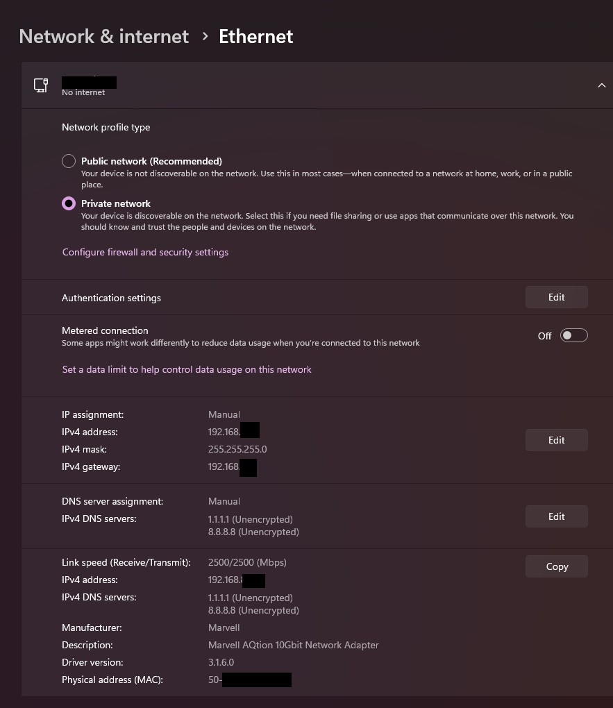 I've been pouring over the docs trying to work out why I lose connectivity if I connect a 10Gbit card/cat-8 cable to the 2.5Gbit WAN/LAN port. It negotiates at 2500, but there's no connectivity beyond that.
