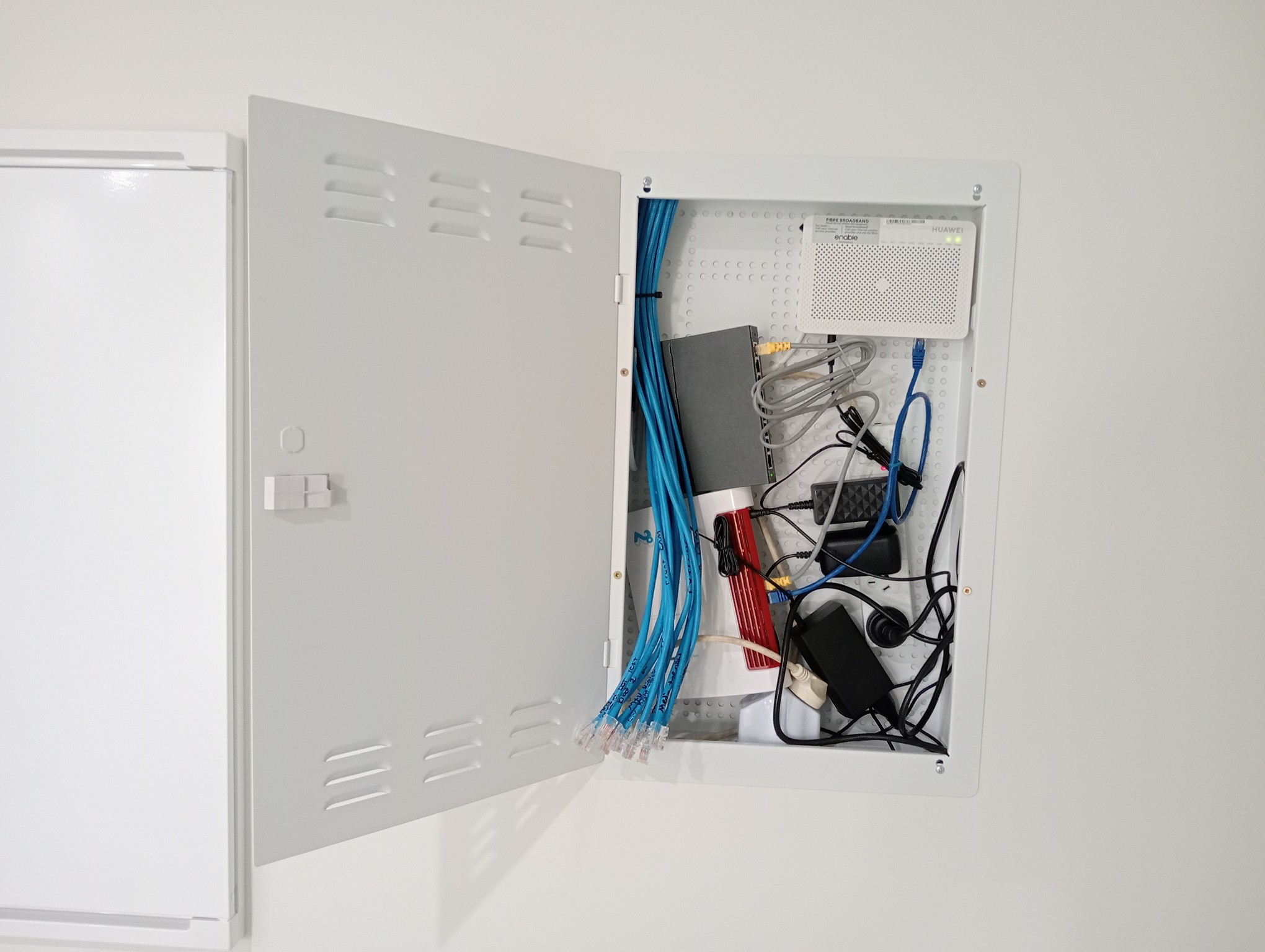 It is a new build house with ports to rooms and 4 going to camera spots. How can I tidy this up, I need to fit in a 4 port POE switch, the two degrees router and another switch for the rest.