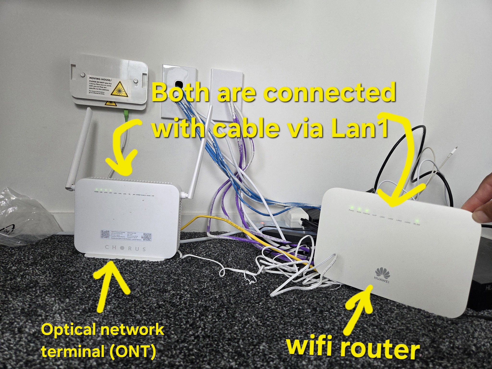 The Chorus ONT despite (seemingly) being a wifi router itself doesn't broadcast wifi but is obviously required to accept the incoming fibre. Is this a normal looking setup? I am new to fibre.