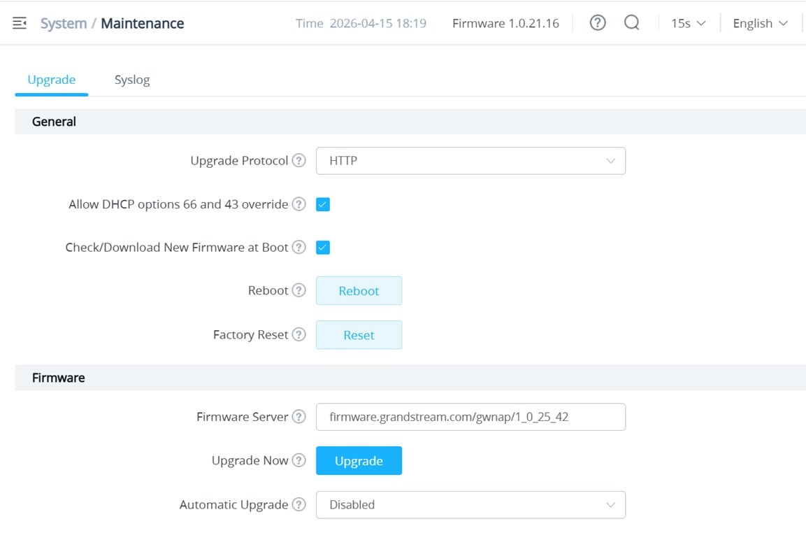 I'm trying to update the firmware on a pair of GWN7660 APs. I log into the management of the master AP and go to the System/Maintenance page and configure it as below. However, when I click the 'Ugrade' button, I get the error message "Obatin server firmware failed!". I assumed that's meant to say "Obtain...".