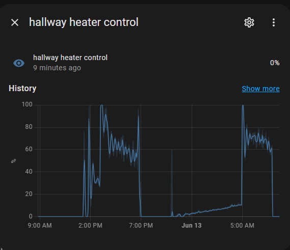 The Mill is able to modulate. It has a control signal it uses to vary the output of the heater. Below is a screenshot of the HA integration showing the control signal (0-100%) over the course of the last 24hrs. That modulates the heat out from 0W - 1500W.