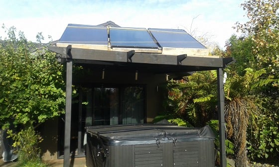 Solar panels on the roof heat the pool, water is pumped through panels using a dishwasher pump and a hot water thermostat.