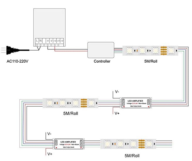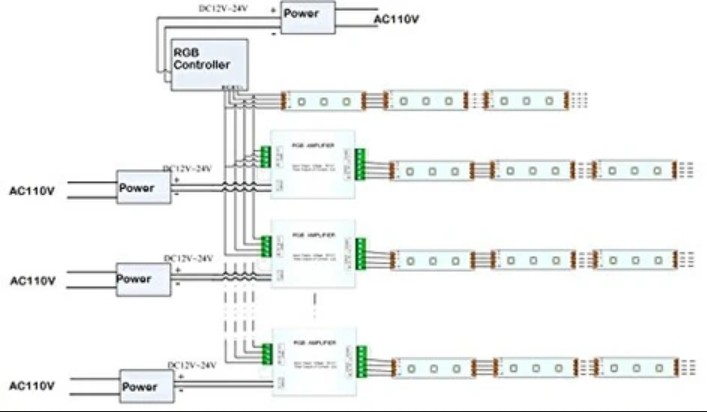 so do you think running equal runs from the controller to the strips would help? If I could connect two strips to each "amplifier" then it would simplify it a little.