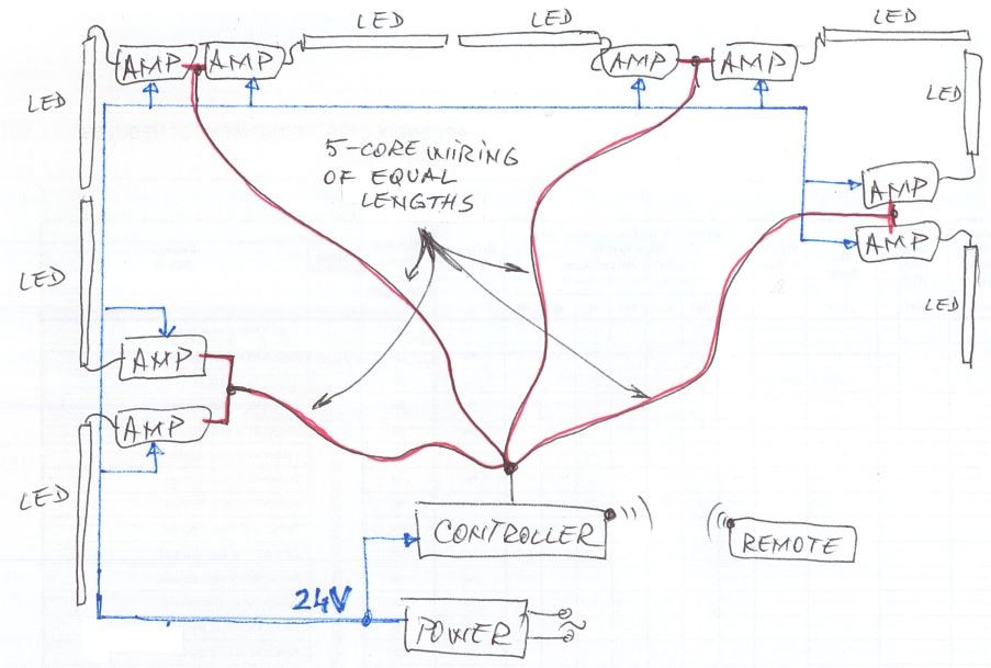 Colour variation: as I said, there is still some difference between the colours at the start and at the end in this setup, would it help to split the RGBW signal from the controller and feed it somewhere in the middle too? This will be only 4-core wire, not all 5 cores as the power comes from the amplifiers? This is shown with dotted red line in the sketch in this post. What I find interesting is the first two strips have one colour and all the others have this "slightly different" colour fairly constant all the way to the end, the colour does not gradually change along the 9 strips as expected - so there might be something wrong with that first amplifier? Will swap / replace and see if this helps with colour consistency.