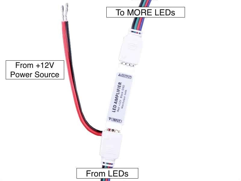 The power supply voltage is lower at the tail end of each strip than at the controller end, because the wires inside the strips are very thin. So if you just connect another strip (or 2 or 3)  on, it won't work because the second or third strip's voltage will be too low. This will be worse if all the LEDs are at full brightness. The solution is to run a pair of heavier (22AWG or so if you have 12V strips) wires from the power supply direct (i.e. from *before* the controller) to V+ and V- between the strips... i.e. to an "amplifier". The amplifiers will almost certainly not amplify anything. They just act as a convenient point to inject your power supply. You don't need amplifiers on the signal lines, because the strips are controlled digitally. Each LED controller chip (for a group of three LEDs) outputs a new, full-strength signal to the next LED controller chip.