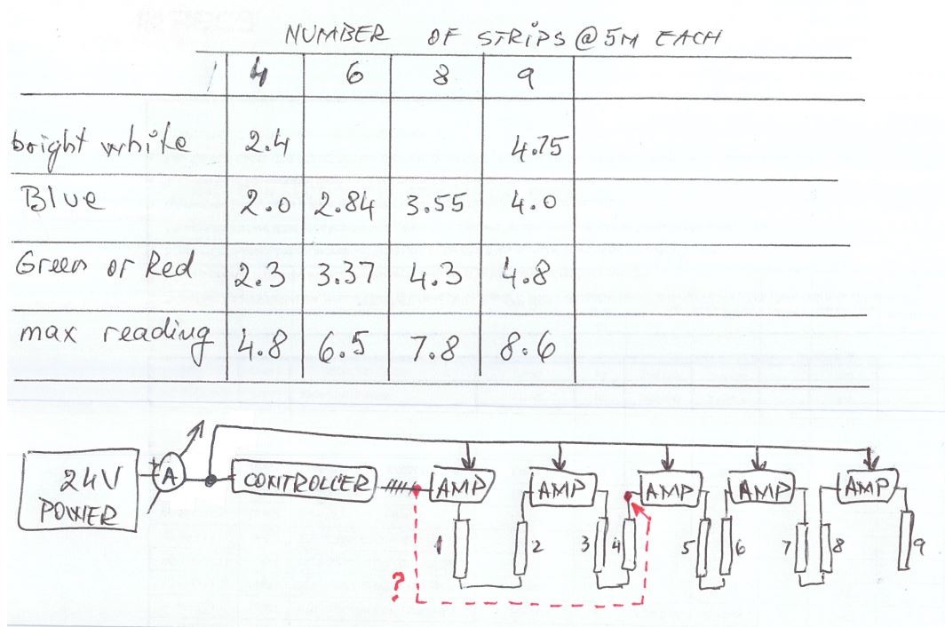 Still got very small colour difference between the start of first strip and the end of the last one SOMETIMES (the difference is more obvious on some colours than others). The current readings are way lower than I expected, here is a table summarizing the current readings on various colours and strips connected, a sketch of the wiring configuration is also included: