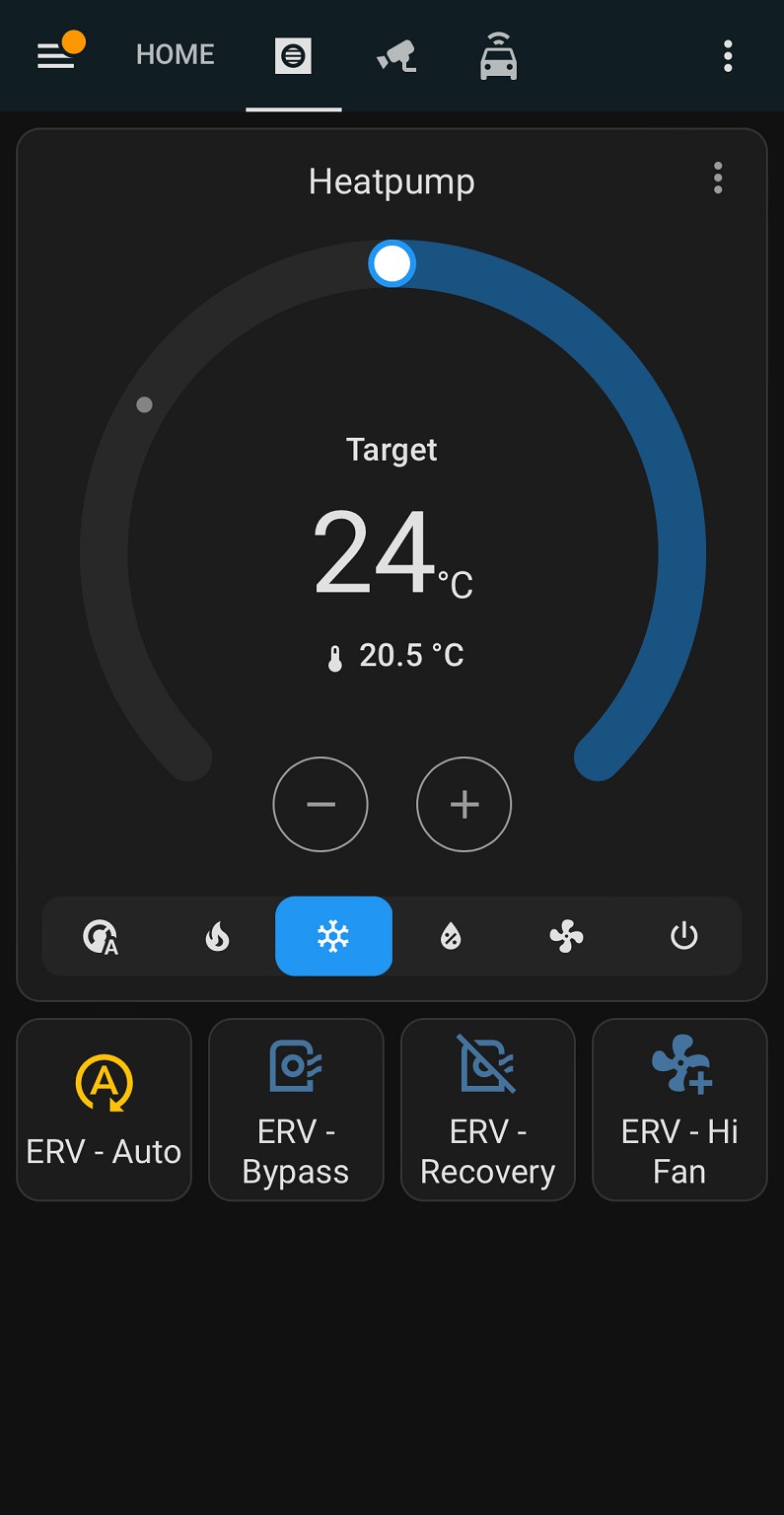 Next was getting it into HA. I have a network based modbus gateway on the way from Aliexpress but in the meantime, I had a USB based one which HA picked up right away. Using this integration guide, I was able to set up a modbus Climate entity that matched to the correct registers outlined in the RTD manual. However, the default modbus integration assumes that the Target Temp and Current Temp use the same scale, however the RTD does not - Target Temp needs to be 1 while Current Temp needs to be 0.01. Thankfully, someone has made a mod for this exact issue which can be installed via HACS. For the ERV control, I decided just to go with switches to set each mode and to toggle between the two ventilation fan speeds. My config as of making this post now looks like this: