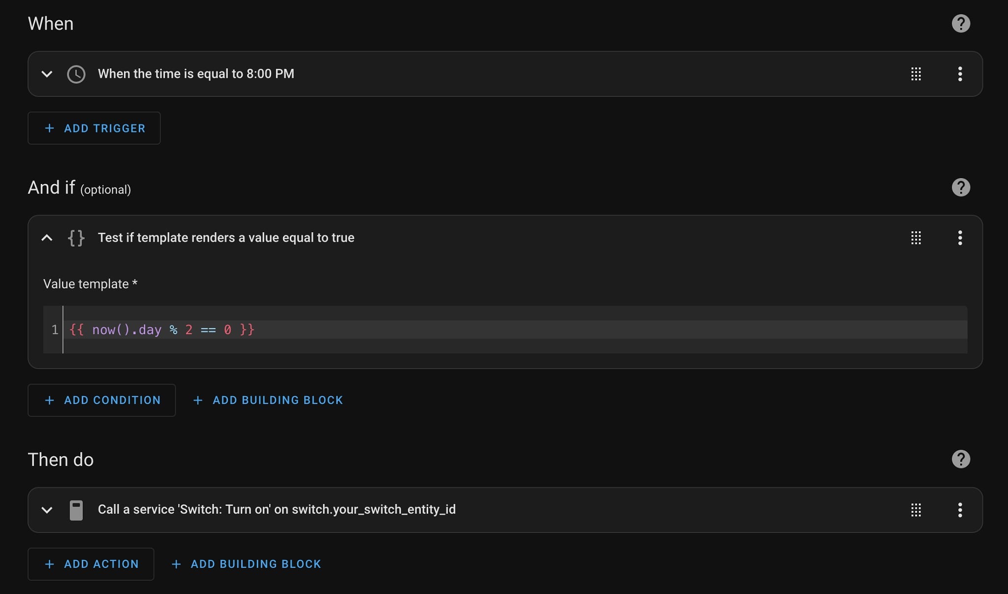 value_template: "{{ now().day % 2 == 0 }}"