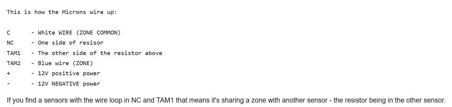 - There are only 4 (4 core) cables for PIRs coming into the panel. This leads me to believe two (perhaps the Microns in the bedrooms are wired to one of the 4 other cables circuits/zones - either in parallel or series)