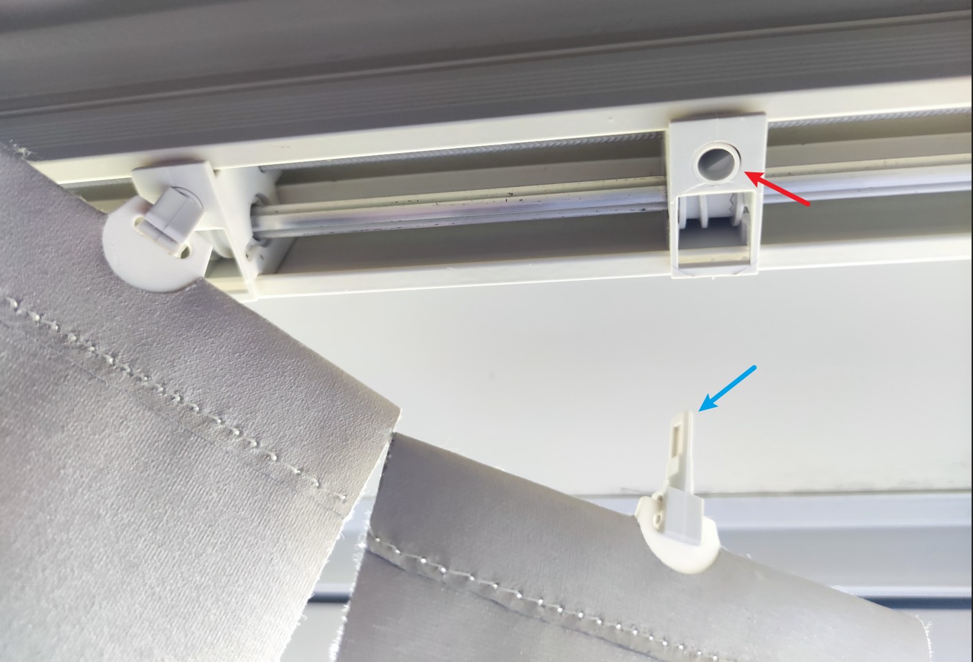 My kid accidentally knocked one of the vertical blind slats loose, and it fell onto the floor. I think there’s a small clip or piece at the top of the slat (shown by the blue arrow) that fits into the small hole (shown by the red arrow) to hold it in place. If I can get a replacement and put it back, that should fix it. Am I right? If so, does anyone know what this part is called and where I can get one?