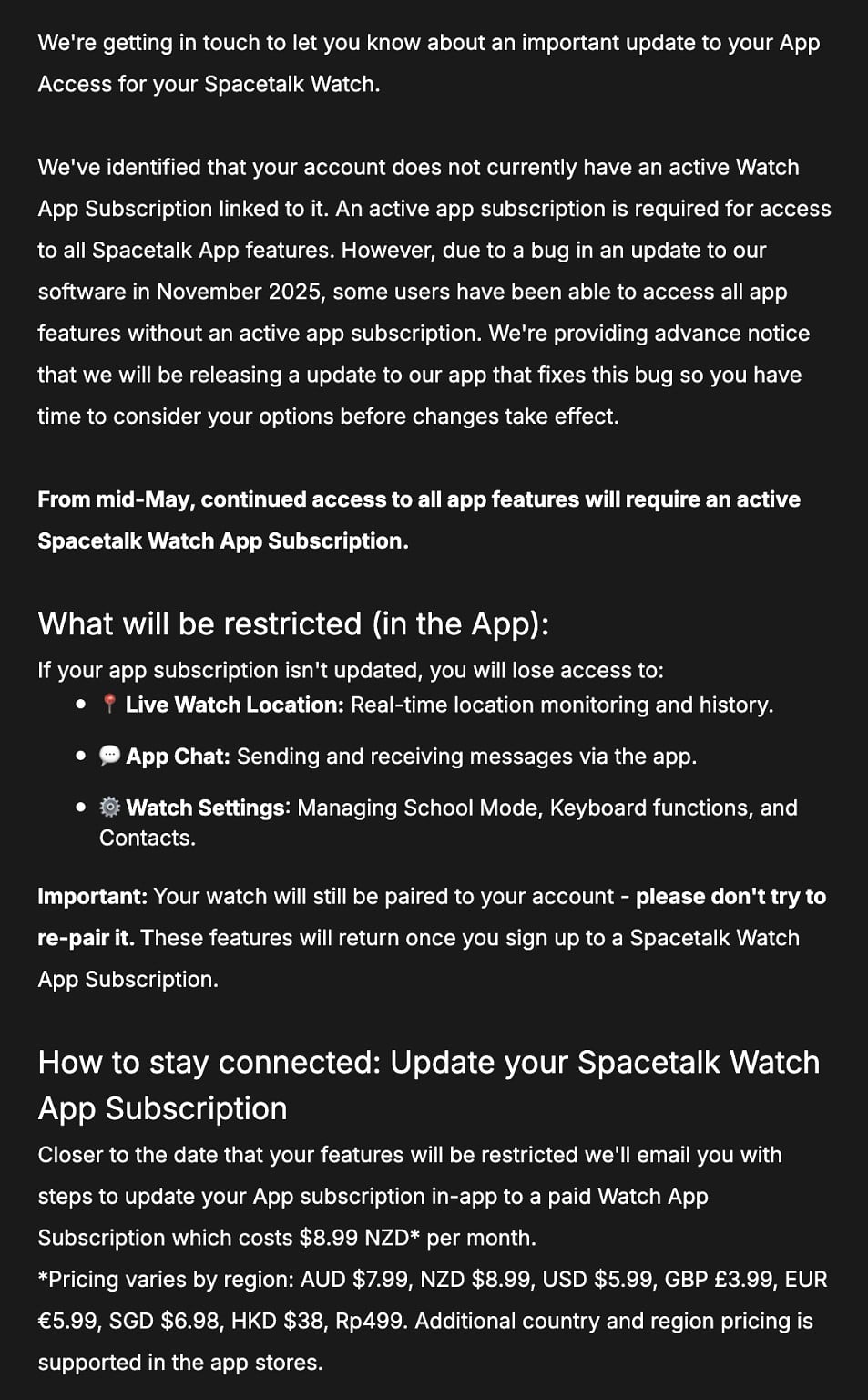 After this change, without spending $9 the $274 watch is basically a brick.