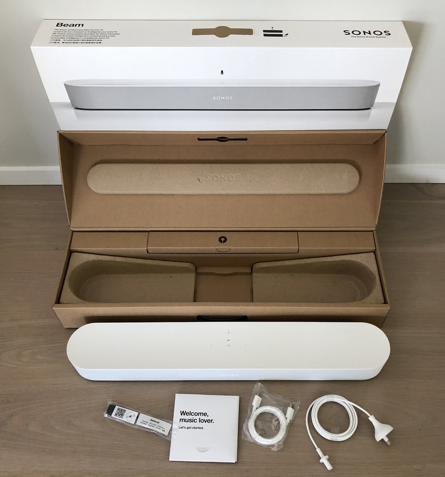It has been wall-mounted from new (wall mount not included). In original box with protective packing. Brand-new, white Sonos HDMI and power cables, HDMI/Optical adapter and all original documentation.