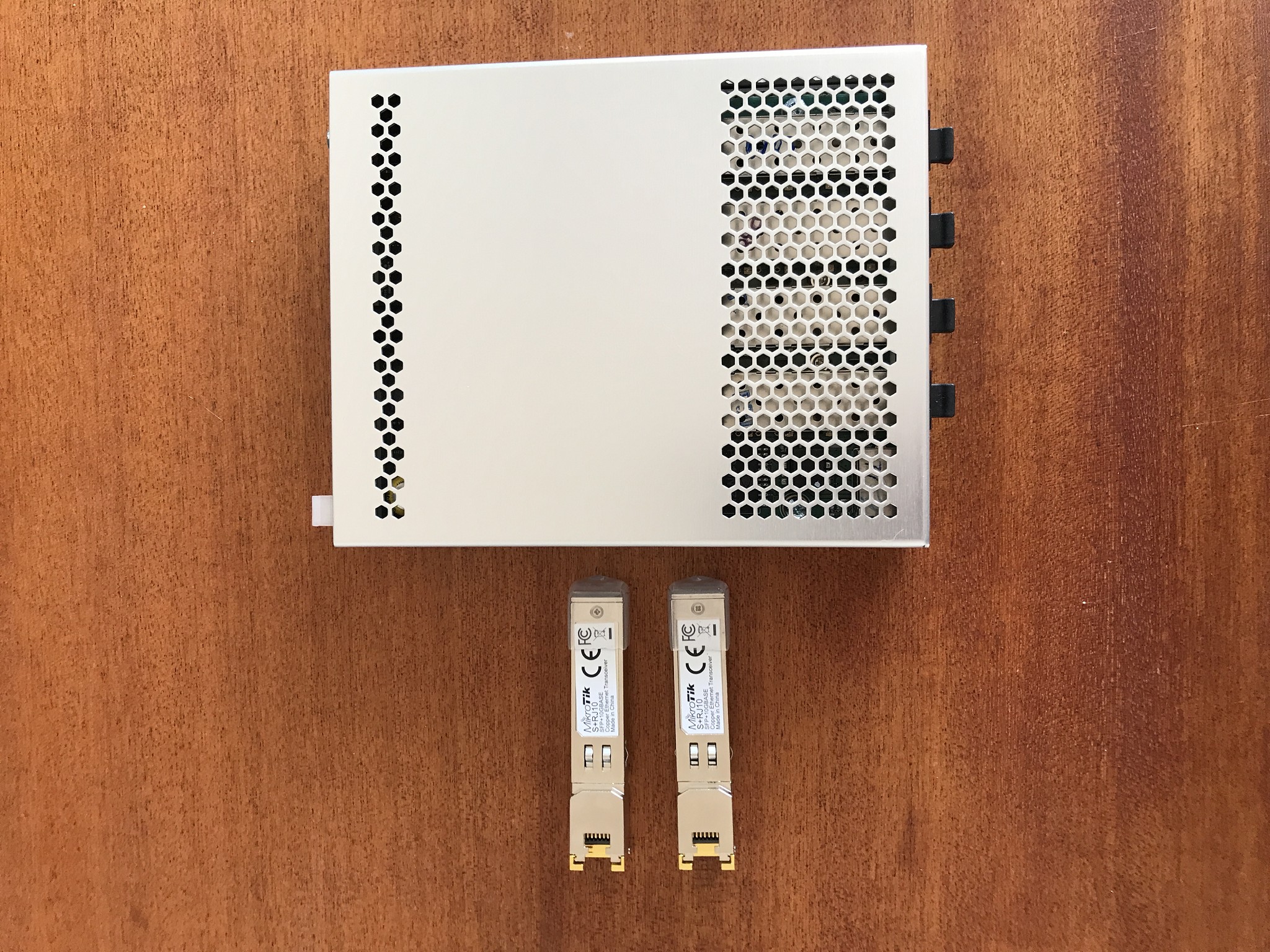 Up for sale I have a very tidy Mikrotik 10GbE switch (model no: crs305-1g-4s+in), as well as two 10GBe RJ45 SFP+ transeivers (model no: S+RJ10).