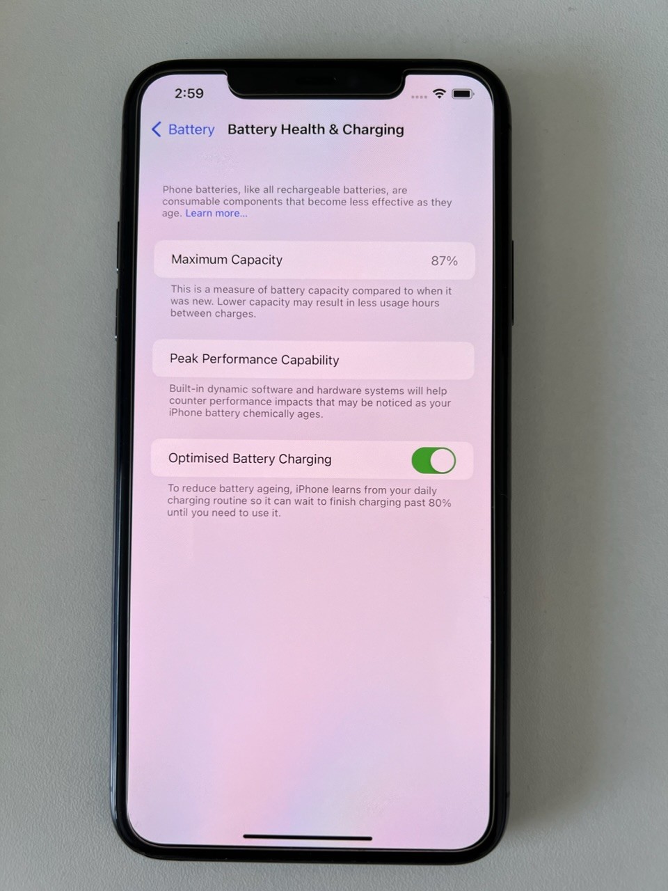 87% battery capacity (prior to reset) as per photo